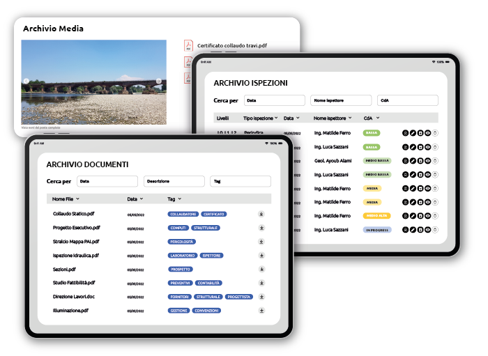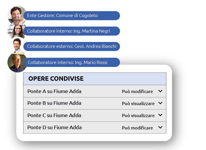 Ispettori ed Enti Gestori possono operare insieme, ognuno con i propri ruoli e responsabilità. Inoltre, le informazioni delle opere sono archiviate e organizzate in modo da essere facilmente esportate e trasferite anche al Ministero (AINOP) e ANSFISA.