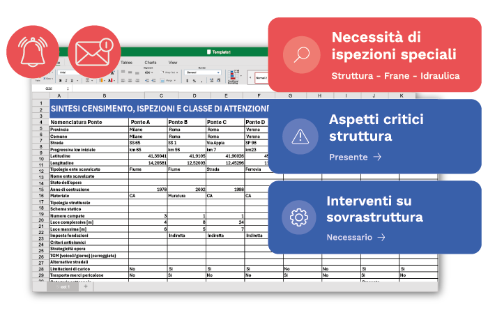 Una serie di strumenti digitali supportano il processo di pianificazione delle azioni di sorveglianza del Patrimonio Infrastrutturale: esportazione del .csv manutenzione, notifiche di avvenuta ispezione, promemoria per scadenza ispezioni, avvisi di nuove ispezioni da eseguire, possibilità di ricercare le opere in base al risultato della CdA o altri numerosi filtri.